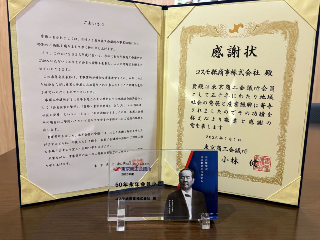 令和8年3月に東京商工会議所より50年永年会員表彰を頂きました。